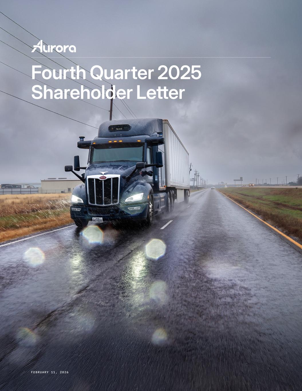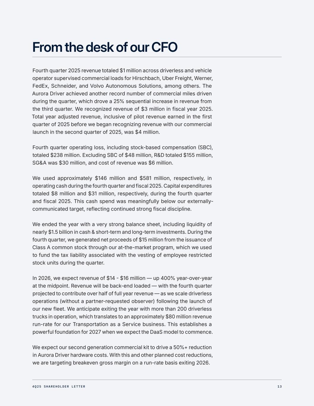 From the desk of our CFO Fourth quarter 2025 revenue totaled $1 million across driverless and vehicle operator supervised commercial loads for Hirschbach, Uber Freight, Werner, FedEx, Schneider, and Volvo Autonomous Solutions, among others. The Aurora Driver achieved another record number of commercial miles driven during the quarter, which drove a 25% sequential increase in revenue from the third quarter. We recognized revenue of $3 million in fiscal year 2025. Total year adjusted revenue, inclusive of pilot revenue earned in the first quarter of 2025 before we began recognizing revenue with our commercial launch in the second quarter of 2025, was $4 million. Fourth quarter operating loss, including stock-based compensation (SBC), totaled $238 million. Excluding SBC of $48 million, R&D totaled $155 million, SG&A was $30 million, and cost of revenue was $6 million. We used approximately $146 million and $581 million, respectively, in operating cash during the fourth quarter and fiscal 2025. Capital expenditures totaled $8 million and $31 million, respectively, during the fourth quarter and fiscal 2025. This cash spend was meaningfully below our externally- communicated target, reflecting continued strong fiscal discipline. We ended the year with a very strong balance sheet, including liquidity of nearly $1.5 billion in cash & short-term and long-term investments. During the fourth quarter, we generated net proceeds of $15 million from the issuance of Class A common stock through our at-the-market program, which we used to fund the tax liability associated with the vesting of employee restricted stock units during the quarter. In 2026, we expect revenue of $14 - $16 million — up 400% year-over-year at the midpoint. Revenue will be back-end loaded — with the fourth quarter projected to contribute over half of full year revenue — as we scale driverless operations (without a partner-requested observer) following the launch of our new fleet. We anticipate exiting the year with more than 200 driverless trucks in operation, which translates to an approximately $80 million revenue run-rate for our Transportation as a Service business. This establishes a powerful foundation for 2027 when we expect the DaaS model to commence. We expect our second generation commercial kit to drive a 50%+ reduction in Aurora Driver hardware costs. With this and other planned cost reductions, we are targeting breakeven gross margin on a run-rate basis exiting 2026. 134Q25 SHAREHOLDER LETTER