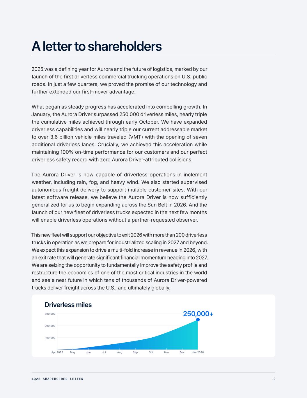 A letter to shareholders 2025 was a defining year for Aurora and the future of logistics, marked by our launch of the first driverless commercial trucking operations on U.S. public roads. In just a few quarters, we proved the promise of our technology and further extended our first-mover advantage. What began as steady progress has accelerated into compelling growth. In January, the Aurora Driver surpassed 250,000 driverless miles, nearly triple the cumulative miles achieved through early October. We have expanded driverless capabilities and will nearly triple our current addressable market to over 3.6 billion vehicle miles traveled (VMT) with the opening of seven additional driverless lanes. Crucially, we achieved this acceleration while maintaining 100% on-time performance for our customers and our perfect driverless safety record with zero Aurora Driver-attributed collisions. The Aurora Driver is now capable of driverless operations in inclement weather, including rain, fog, and heavy wind. We also started supervised autonomous freight delivery to support multiple customer sites. With our latest software release, we believe the Aurora Driver is now sufficiently generalized for us to begin expanding across the Sun Belt in 2026. And the launch of our new fleet of driverless trucks expected in the next few months will enable driverless operations without a partner-requested observer. This new fleet will support our objective to exit 2026 with more than 200 driverless trucks in operation as we prepare for industrialized scaling in 2027 and beyond. We expect this expansion to drive a multi-fold increase in revenue in 2026, with an exit rate that will generate significant financial momentum heading into 2027. We are seizing the opportunity to fundamentally improve the safety profile and restructure the economics of one of the most critical industries in the world and see a near future in which tens of thousands of Aurora Driver-powered trucks deliver freight across the U.S., and ultimately globally. Driverless miles 300,000 Apr 2025 May Jun Aug SepJul Oct Nov Dec Jan 2026 200,000 100,000 250,000+ 24Q25 SHAREHOLDER LETTER