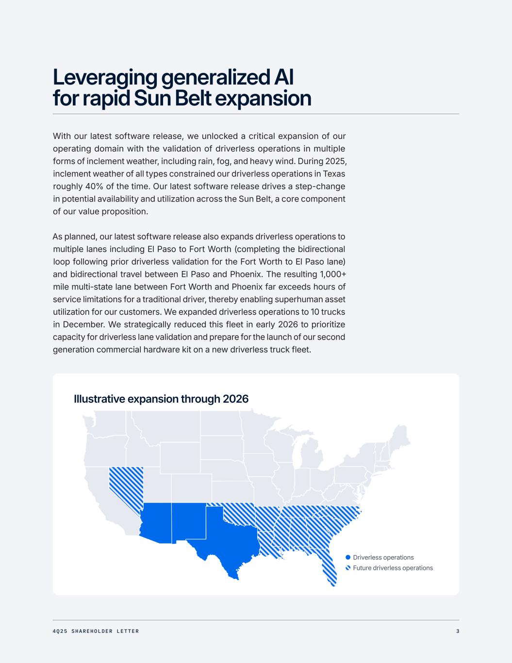 Leveraging generalized AI for rapid Sun Belt expansion With our latest software release, we unlocked a critical expansion of our operating domain with the validation of driverless operations in multiple forms of inclement weather, including rain, fog, and heavy wind. During 2025, inclement weather of all types constrained our driverless operations in Texas roughly 40% of the time. Our latest software release drives a step-change in potential availability and utilization across the Sun Belt, a core component of our value proposition. As planned, our latest software release also expands driverless operations to multiple lanes including El Paso to Fort Worth (completing the bidirectional loop following prior driverless validation for the Fort Worth to El Paso lane) and bidirectional travel between El Paso and Phoenix. The resulting 1,000+ mile multi-state lane between Fort Worth and Phoenix far exceeds hours of service limitations for a traditional driver, thereby enabling superhuman asset utilization for our customers. We expanded driverless operations to 10 trucks in December. We strategically reduced this fleet in early 2026 to prioritize capacity for driverless lane validation and prepare for the launch of our second generation commercial hardware kit on a new driverless truck fleet. Illustrative expansion through 2026 Driverless operations Future driverless operations 34Q25 SHAREHOLDER LETTER