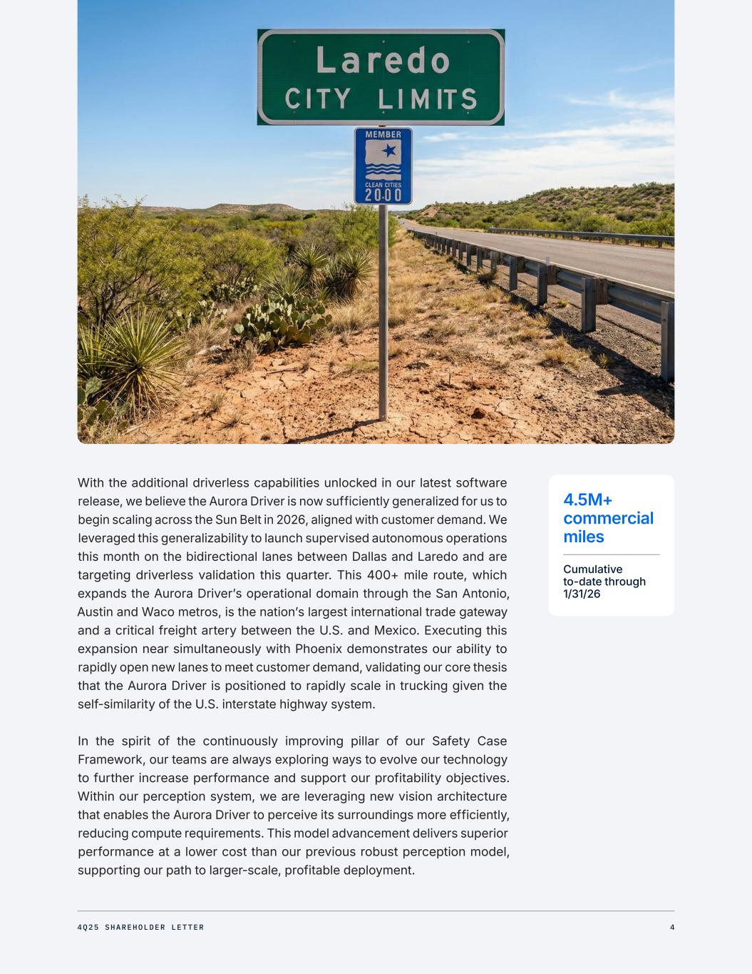 With the additional driverless capabilities unlocked in our latest software release, we believe the Aurora Driver is now sufficiently generalized for us to begin scaling across the Sun Belt in 2026, aligned with customer demand. We leveraged this generalizability to launch supervised autonomous operations this month on the bidirectional lanes between Dallas and Laredo and are targeting driverless validation this quarter. This 400+ mile route, which expands the Aurora Driver’s operational domain through the San Antonio, Austin and Waco metros, is the nation’s largest international trade gateway and a critical freight artery between the U.S. and Mexico. Executing this expansion near simultaneously with Phoenix demonstrates our ability to rapidly open new lanes to meet customer demand, validating our core thesis that the Aurora Driver is positioned to rapidly scale in trucking given the self-similarity of the U.S. interstate highway system. In the spirit of the continuously improving pillar of our Safety Case Framework, our teams are always exploring ways to evolve our technology to further increase performance and support our profitability objectives. Within our perception system, we are leveraging new vision architecture that enables the Aurora Driver to perceive its surroundings more efficiently, reducing compute requirements. This model advancement delivers superior performance at a lower cost than our previous robust perception model, supporting our path to larger-scale, profitable deployment. 4.5M+ commercial miles Cumulative to-date through 1/31/26 44Q25 SHAREHOLDER LETTER