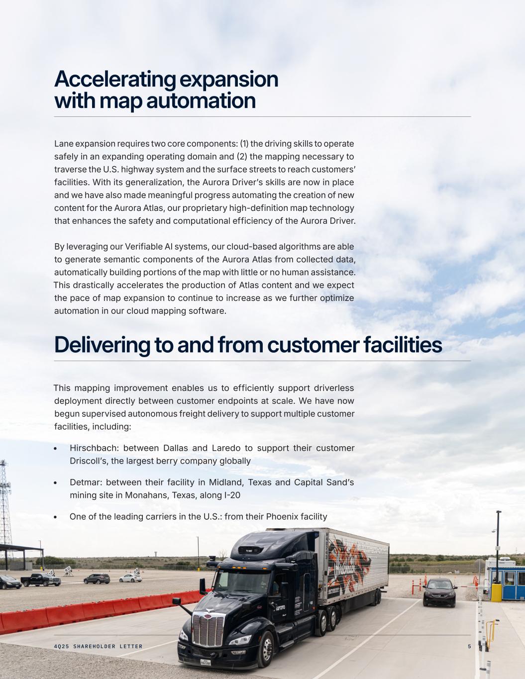 Accelerating expansion with map automation Lane expansion requires two core components: (1) the driving skills to operate safely in an expanding operating domain and (2) the mapping necessary to traverse the U.S. highway system and the surface streets to reach customers’ facilities. With its generalization, the Aurora Driver’s skills are now in place and we have also made meaningful progress automating the creation of new content for the Aurora Atlas, our proprietary high-definition map technology that enhances the safety and computational efficiency of the Aurora Driver. By leveraging our Verifiable AI systems, our cloud-based algorithms are able to generate semantic components of the Aurora Atlas from collected data, automatically building portions of the map with little or no human assistance. This drastically accelerates the production of Atlas content and we expect the pace of map expansion to continue to increase as we further optimize automation in our cloud mapping software. Delivering to and from customer facilities This mapping improvement enables us to efficiently support driverless deployment directly between customer endpoints at scale. We have now begun supervised autonomous freight delivery to support multiple customer facilities, including: • Hirschbach: between Dallas and Laredo to support their customer Driscoll’s, the largest berry company globally • Detmar: between their facility in Midland, Texas and Capital Sand’s mining site in Monahans, Texas, along I-20 • One of the leading carriers in the U.S.: from their Phoenix facility 54Q25 SHAREHOLDER LETTER