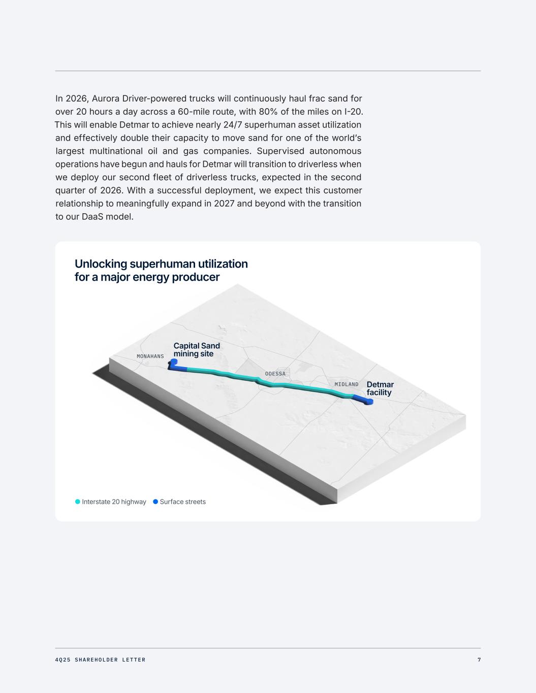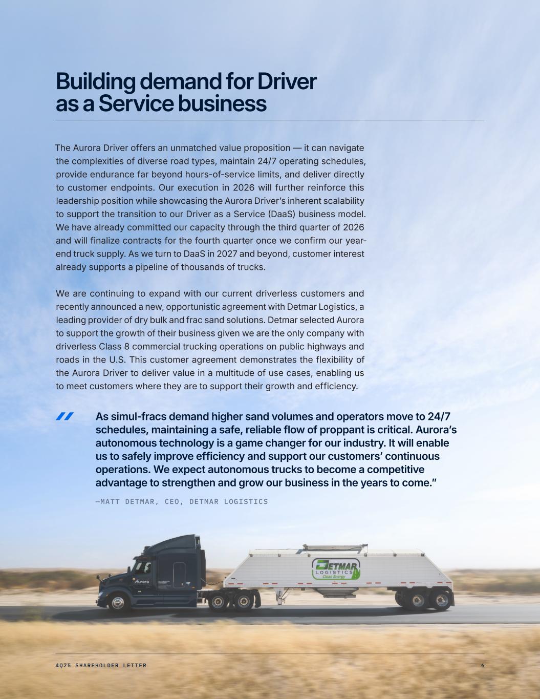 Building demand for Driver as a Service business The Aurora Driver offers an unmatched value proposition — it can navigate the complexities of diverse road types, maintain 24/7 operating schedules, provide endurance far beyond hours-of-service limits, and deliver directly to customer endpoints. Our execution in 2026 will further reinforce this leadership position while showcasing the Aurora Driver’s inherent scalability to support the transition to our Driver as a Service (DaaS) business model. We have already committed our capacity through the third quarter of 2026 and will finalize contracts for the fourth quarter once we confirm our year- end truck supply. As we turn to DaaS in 2027 and beyond, customer interest already supports a pipeline of thousands of trucks. We are continuing to expand with our current driverless customers and recently announced a new, opportunistic agreement with Detmar Logistics, a leading provider of dry bulk and frac sand solutions. Detmar selected Aurora to support the growth of their business given we are the only company with driverless Class 8 commercial trucking operations on public highways and roads in the U.S. This customer agreement demonstrates the flexibility of the Aurora Driver to deliver value in a multitude of use cases, enabling us to meet customers where they are to support their growth and efficiency. As simul-fracs demand higher sand volumes and operators move to 24/7 schedules, maintaining a safe, reliable flow of proppant is critical. Aurora’s autonomous technology is a game changer for our industry. It will enable us to safely improve efficiency and support our customers’ continuous operations. We expect autonomous trucks to become a competitive advantage to strengthen and grow our business in the years to come.” —MATT DETMAR, CEO, DETMAR LOGISTICS 64Q25 SHAREHOLDER LETTER