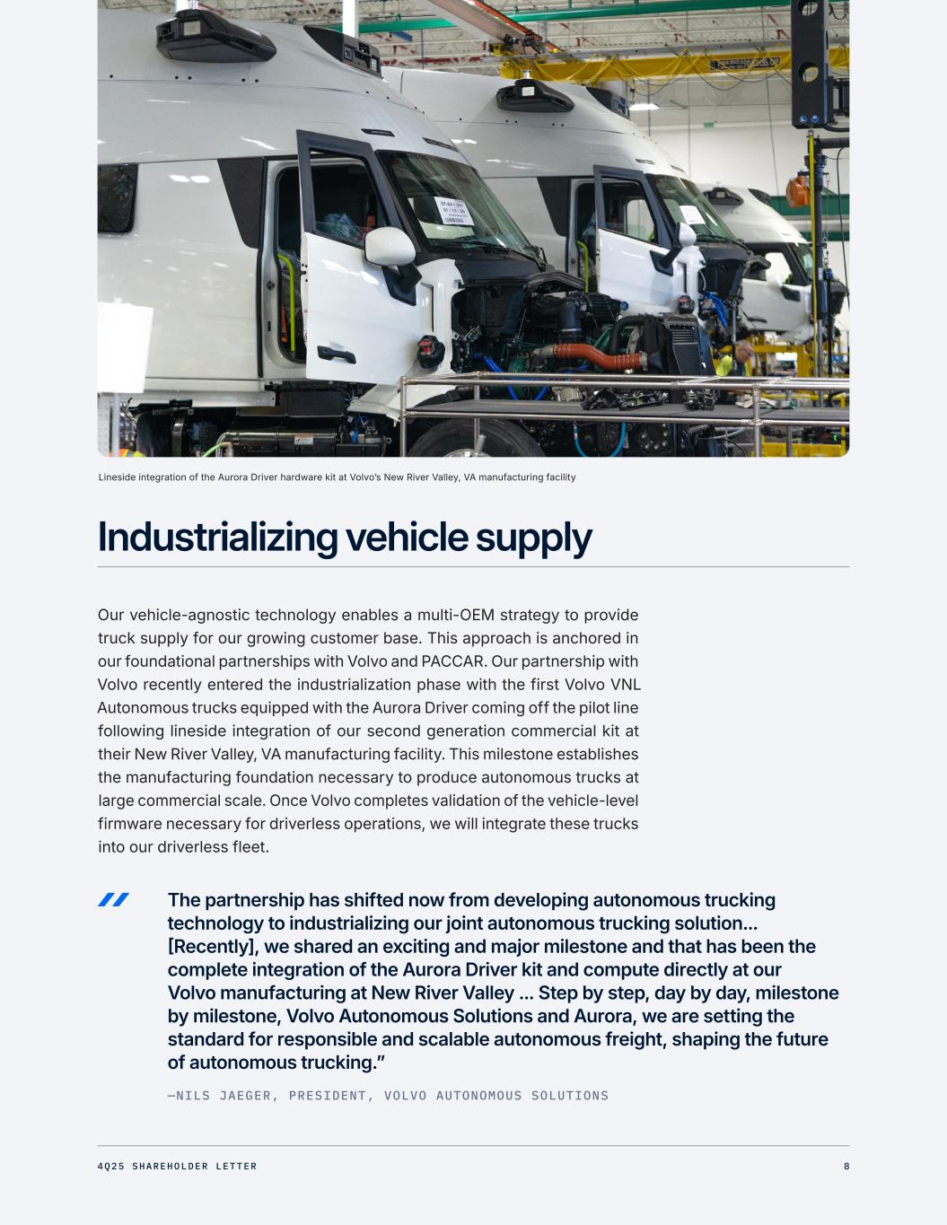 Lineside integration of the Aurora Driver hardware kit at Volvo’s New River Valley, VA manufacturing facility Industrializing vehicle supply Our vehicle-agnostic technology enables a multi-OEM strategy to provide truck supply for our growing customer base. This approach is anchored in our foundational partnerships with Volvo and PACCAR. Our partnership with Volvo recently entered the industrialization phase with the first Volvo VNL Autonomous trucks equipped with the Aurora Driver coming off the pilot line following lineside integration of our second generation commercial kit at their New River Valley, VA manufacturing facility. This milestone establishes the manufacturing foundation necessary to produce autonomous trucks at large commercial scale. Once Volvo completes validation of the vehicle-level firmware necessary for driverless operations, we will integrate these trucks into our driverless fleet. The partnership has shifted now from developing autonomous trucking technology to industrializing our joint autonomous trucking solution... [Recently], we shared an exciting and major milestone and that has been the complete integration of the Aurora Driver kit and compute directly at our Volvo manufacturing at New River Valley ... Step by step, day by day, milestone by milestone, Volvo Autonomous Solutions and Aurora, we are setting the standard for responsible and scalable autonomous freight, shaping the future of autonomous trucking.” —NILS JAEGER, PRESIDENT, VOLVO AUTONOMOUS SOLUTIONS 84Q25 SHAREHOLDER LETTER