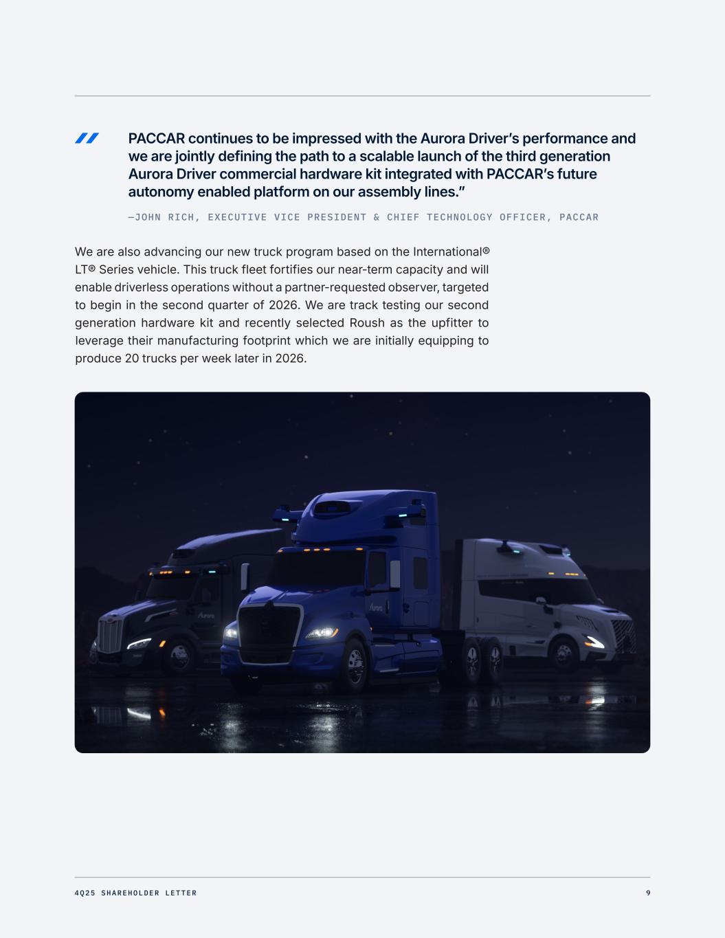 We are also advancing our new truck program based on the International® LT® Series vehicle. This truck fleet fortifies our near-term capacity and will enable driverless operations without a partner-requested observer, targeted to begin in the second quarter of 2026. We are track testing our second generation hardware kit and recently selected Roush as the upfitter to leverage their manufacturing footprint which we are initially equipping to produce 20 trucks per week later in 2026. PACCAR continues to be impressed with the Aurora Driver’s performance and we are jointly defining the path to a scalable launch of the third generation Aurora Driver commercial hardware kit integrated with PACCAR’s future autonomy enabled platform on our assembly lines.” —JOHN RICH, EXECUTIVE VICE PRESIDENT & CHIEF TECHNOLOGY OFFICER, PACCAR 94Q25 SHAREHOLDER LETTER