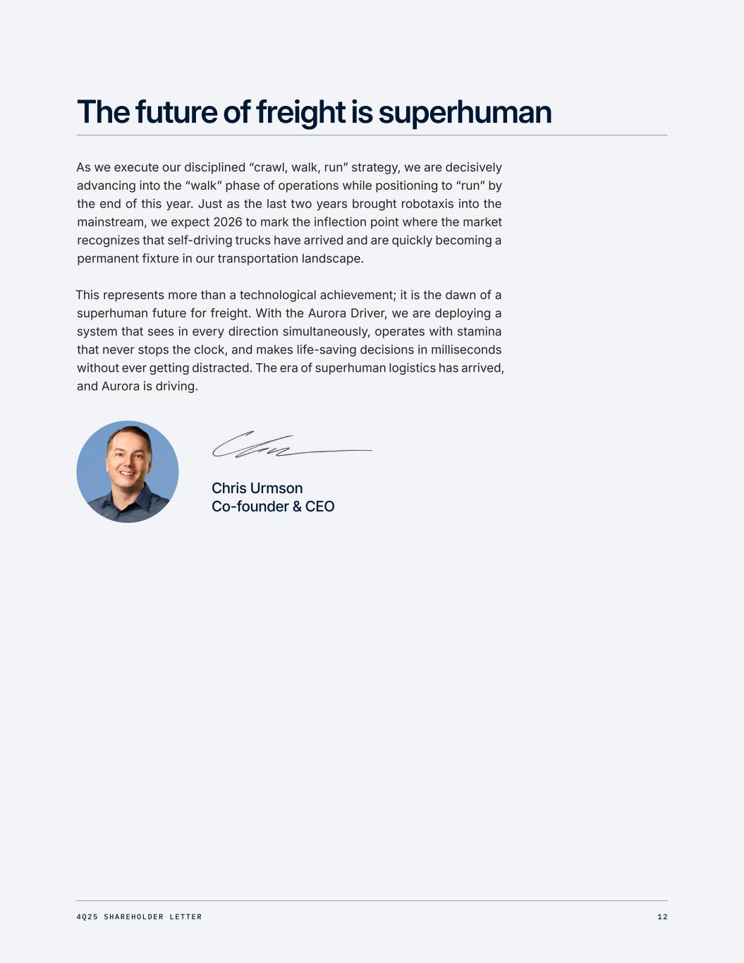 The future of freight is superhuman As we execute our disciplined “crawl, walk, run” strategy, we are decisively advancing into the “walk” phase of operations while positioning to “run” by the end of this year. Just as the last two years brought robotaxis into the mainstream, we expect 2026 to mark the inflection point where the market recognizes that self-driving trucks have arrived and are quickly becoming a permanent fixture in our transportation landscape. This represents more than a technological achievement; it is the dawn of a superhuman future for freight. With the Aurora Driver, we are deploying a system that sees in every direction simultaneously, operates with stamina that never stops the clock, and makes life-saving decisions in milliseconds without ever getting distracted. The era of superhuman logistics has arrived, and Aurora is driving. Chris Urmson Co-founder & CEO 124Q25 SHAREHOLDER LETTER
