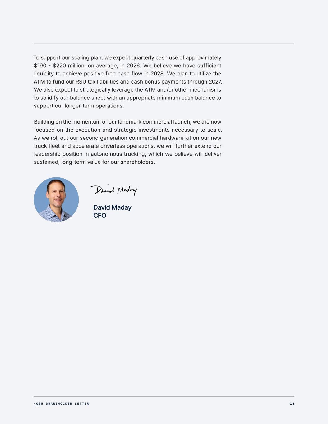 David Maday CFO To support our scaling plan, we expect quarterly cash use of approximately $190 - $220 million, on average, in 2026. We believe we have sufficient liquidity to achieve positive free cash flow in 2028. We plan to utilize the ATM to fund our RSU tax liabilities and cash bonus payments through 2027. We also expect to strategically leverage the ATM and/or other mechanisms to solidify our balance sheet with an appropriate minimum cash balance to support our longer-term operations. Building on the momentum of our landmark commercial launch, we are now focused on the execution and strategic investments necessary to scale. As we roll out our second generation commercial hardware kit on our new truck fleet and accelerate driverless operations, we will further extend our leadership position in autonomous trucking, which we believe will deliver sustained, long-term value for our shareholders. 144Q25 SHAREHOLDER LETTER