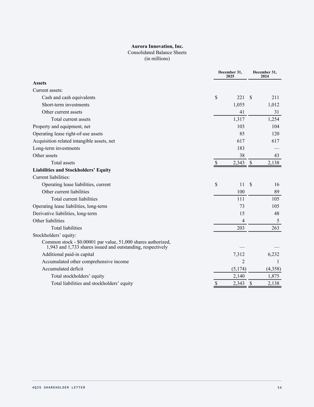 Aurora Innovation, Inc. Consolidated Balance Sheets (in millions) December 31, 2025 December 31, 2024 Assets Current assets: Cash and cash equivalents $ 221 $ 211 Short-term investments 1,055 1,012 Other current assets 41 31 Total current assets 1,317 1,254 Property and equipment, net 103 104 Operating lease right-of-use assets 85 120 Acquisition related intangible assets, net 617 617 Long-term investments 183 — Other assets 38 43 Total assets $ 2,343 $ 2,138 Liabilities and Stockholders’ Equity Current liabilities: Operating lease liabilities, current $ 11 $ 16 Other current liabilities 100 89 Total current liabilities 111 105 Operating lease liabilities, long-term 73 105 Derivative liabilities, long-term 15 48 Other liabilities 4 5 Total liabilities 203 263 Stockholders’ equity: Common stock - $0.00001 par value, 51,000 shares authorized, 1,943 and 1,733 shares issued and outstanding, respectively — — Additional paid-in capital 7,312 6,232 Accumulated other comprehensive income 2 1 Accumulated deficit (5,174) (4,358) Total stockholders’ equity 2,140 1,875 Total liabilities and stockholders’ equity $ 2,343 $ 2,138 164Q25 SHAREHOLDER LETTER
