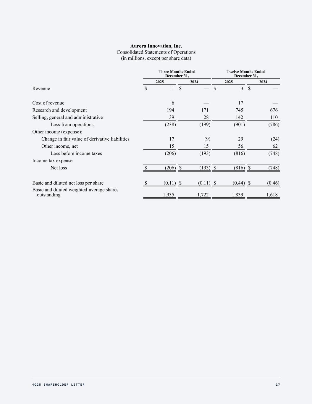 Aurora Innovation, Inc. Consolidated Statements of Operations (in millions, except per share data) Three Months Ended December 31, Twelve Months Ended December 31, 2025 2024 2025 2024 Revenue $ 1 $ — $ 3 $ — Cost of revenue 6 — 17 — Research and development 194 171 745 676 Selling, general and administrative 39 28 142 110 Loss from operations (238) (199) (901) (786) Other income (expense): Change in fair value of derivative liabilities 17 (9) 29 (24) Other income, net 15 15 56 62 Loss before income taxes (206) (193) (816) (748) Income tax expense — — — — Net loss $ (206) $ (193) $ (816) $ (748) Basic and diluted net loss per share $ (0.11) $ (0.11) $ (0.44) $ (0.46) Basic and diluted weighted-average shares outstanding 1,935 1,722 1,839 1,618 174Q25 SHAREHOLDER LETTER