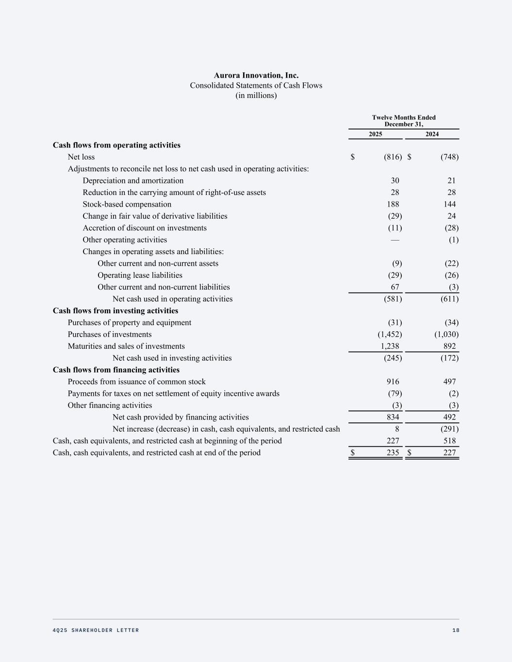 Aurora Innovation, Inc. Consolidated Statements of Cash Flows (in millions) Twelve Months Ended December 31, 2025 2024 Cash flows from operating activities Net loss $ (816) $ (748) Adjustments to reconcile net loss to net cash used in operating activities: Depreciation and amortization 30 21 Reduction in the carrying amount of right-of-use assets 28 28 Stock-based compensation 188 144 Change in fair value of derivative liabilities (29) 24 Accretion of discount on investments (11) (28) Other operating activities — (1) Changes in operating assets and liabilities: Other current and non-current assets (9) (22) Operating lease liabilities (29) (26) Other current and non-current liabilities 67 (3) Net cash used in operating activities (581) (611) Cash flows from investing activities Purchases of property and equipment (31) (34) Purchases of investments (1,452) (1,030) Maturities and sales of investments 1,238 892 Net cash used in investing activities (245) (172) Cash flows from financing activities Proceeds from issuance of common stock 916 497 Payments for taxes on net settlement of equity incentive awards (79) (2) Other financing activities (3) (3) Net cash provided by financing activities 834 492 Net increase (decrease) in cash, cash equivalents, and restricted cash 8 (291) Cash, cash equivalents, and restricted cash at beginning of the period 227 518 Cash, cash equivalents, and restricted cash at end of the period $ 235 $ 227 184Q25 SHAREHOLDER LETTER