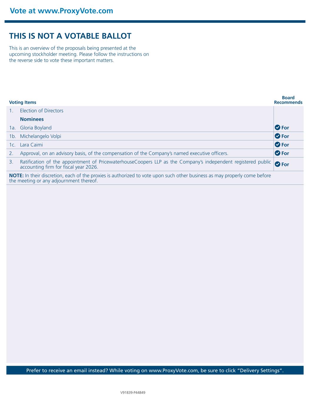 Vote at www.ProxyVote.com Prefer to receive an email instead? While voting on www.ProxyVote.com, be sure to click “Delivery Settings”. Voting Items Board Recommends V91839-P44849 THIS IS NOT A VOTABLE BALLOT This is an overview of the proposals being presented at the upcoming stockholder meeting. Please follow the instructions on the reverse side to vote these important matters. 1. Election of Directors Nominees 1a. Gloria Boyland For 1b. Michelangelo Volpi For 1c. Lara Caimi For 2. Approval, on an advisory basis, of the compensation of the Company’s named executive officers. For 3. Ratification of the appointment of PricewaterhouseCoopers LLP as the Company’s independent registered public accounting firm for fiscal year 2026. For NOTE: In their discretion, each of the proxies is authorized to vote upon such other business as may properly come before the meeting or any adjournment thereof.
